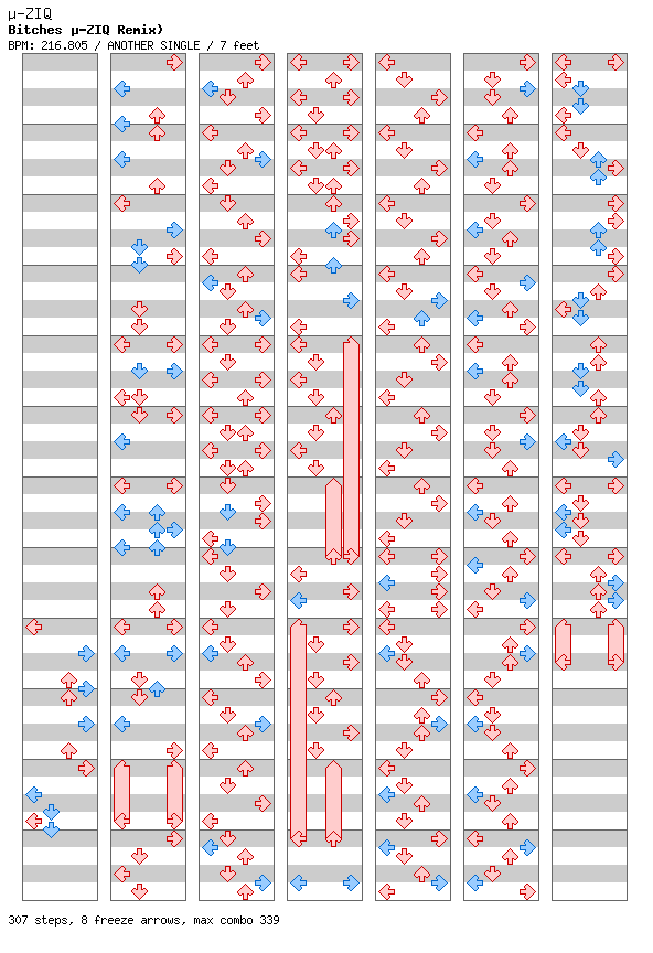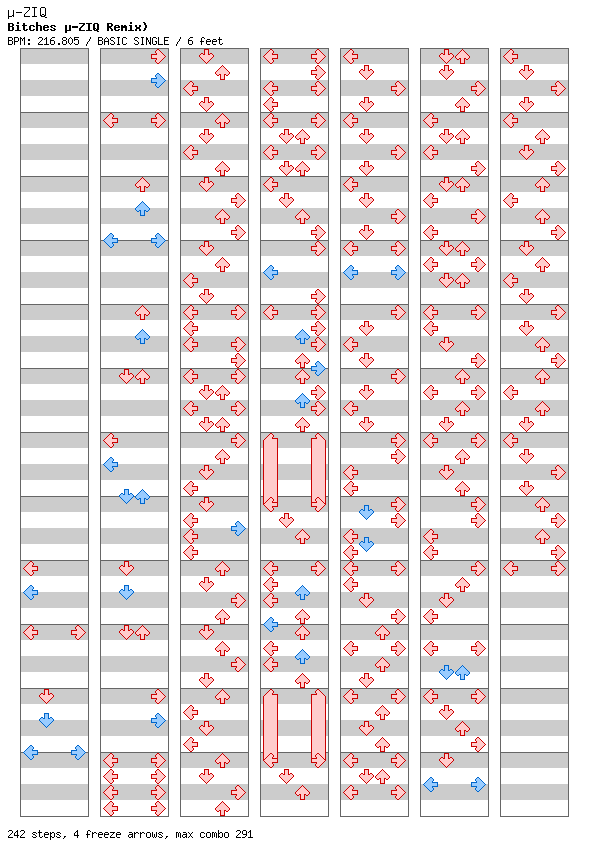 Perhaps the most popular song in Plaguemix One, Bitches was both praised and scorned for the slow BPM. While I definitely stand by the original design of the song, I will admit that a lot of contemplation went into the song before the BPM issue was resolved. Nonetheless, part of me yearned for a faster version, and I often found myself playing the song at 2x scroll. Enter my ever-present music buddy Ash Cairo. He offered up a copy of the Bitches single, which included quite a few interesting remixes of the core tune. One of those remixes caught me by surprise – a desperate, disjointed effort by a musician called “µ-ziq”. This remix reminded me more of classic DDR mainstay PARANOiA than Mindless Self Indulgence’s original tune, and I realized then that I had the opportunity to create a real challenge for those playing Plaguemix Two on dance pads. You have to listen closely to realize this is a remix of Bitches, and you have to pay attention lest you be swept away by the oncoming barrage of steps to dance to! |